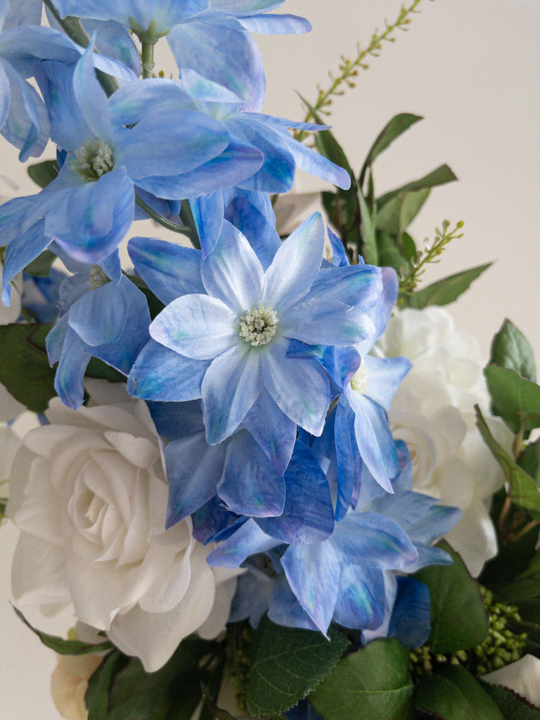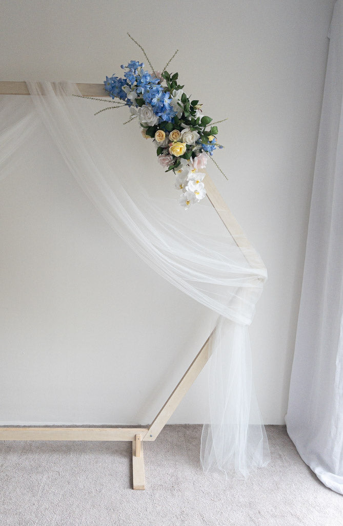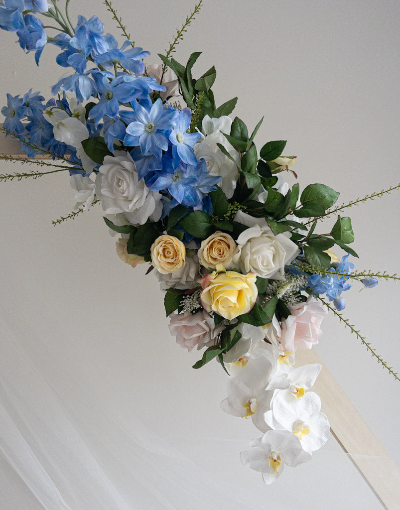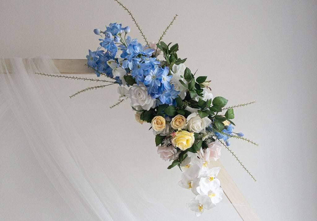 Dit zijden bloemstuk uit de Doris collectie heeft een modern en elegant design. Het geheel is zo natuurgetrouw dat jouw gasten zullen verwachten dat het verse bloemen zijn! In deze zijden bloemen backdrop vind je rozen in pasteltinten gecombineerd met luxe orchideeën en blauwe delphinium.
