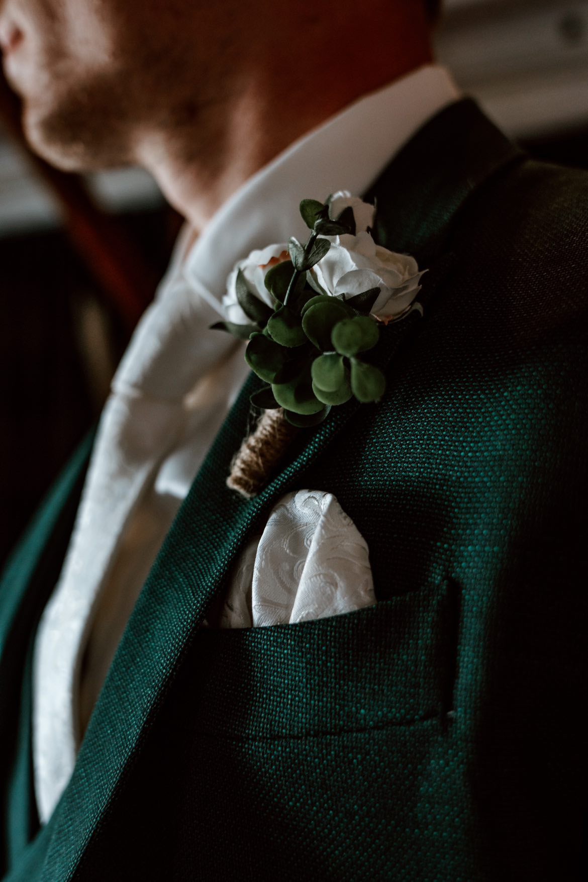 Deze corsage is gemaakt van zijden rozen en kunstgroen. De corsage bestaat uit witte roosjes en groene eucalyptus. Achteraan zit een speld zodat je de corsage gemakkelijk aan een kostuum kan bevestigen.