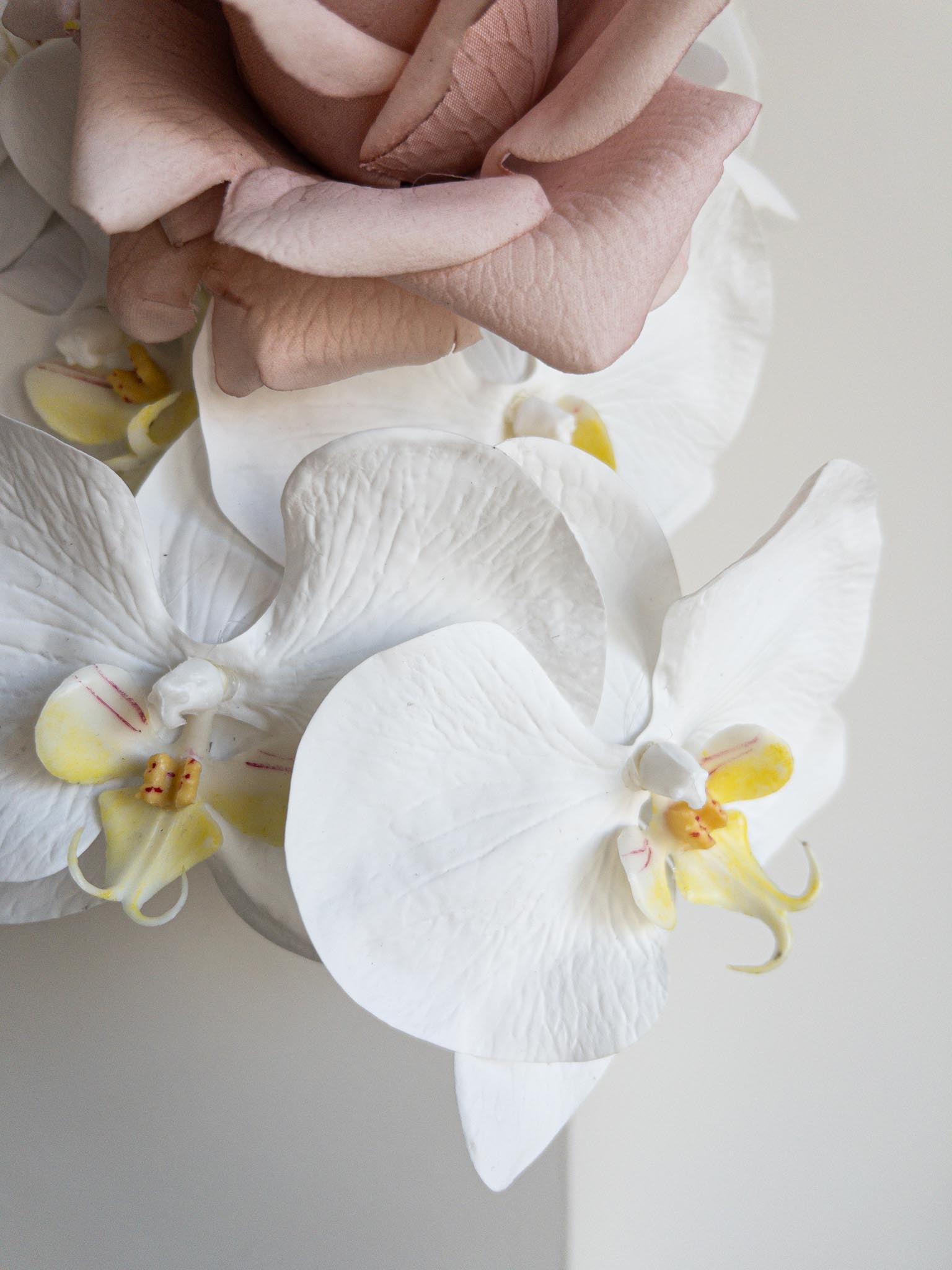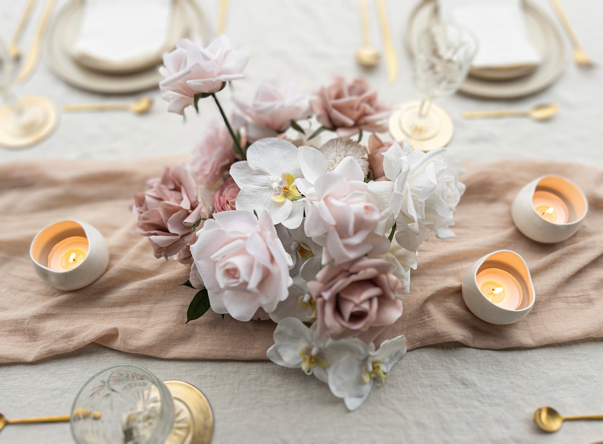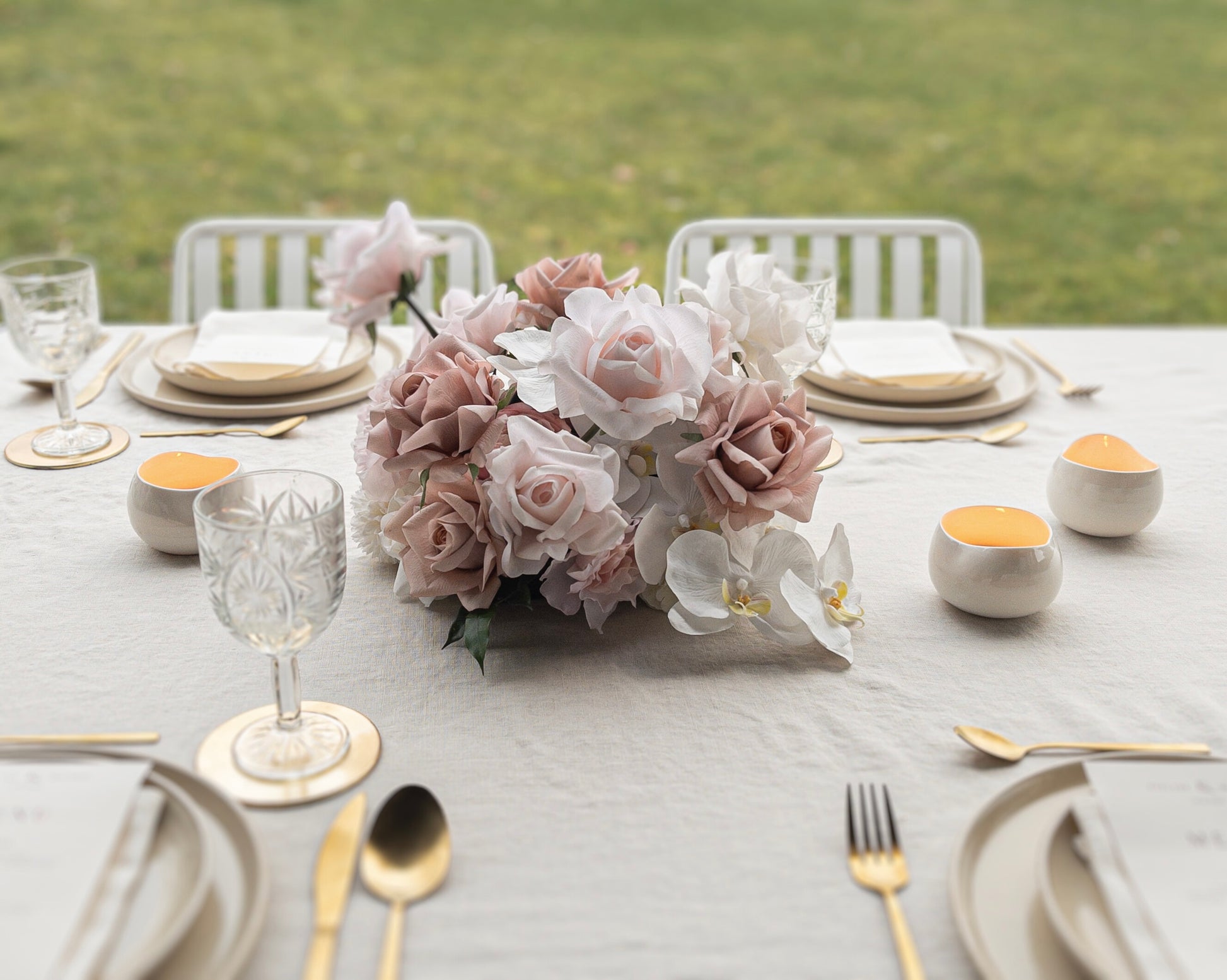 Het tafelstuk uit de Doris collectie bevat maar liefst 17 real touch rozen die er niet alleen fris uitzien, maar ook aanvoelen als verse rozen. Je gasten zullen niet geloven dat het zijden bloemen zijn. Een mooi, grote orchidee maakt het elegante ontwerp helemaal af.
