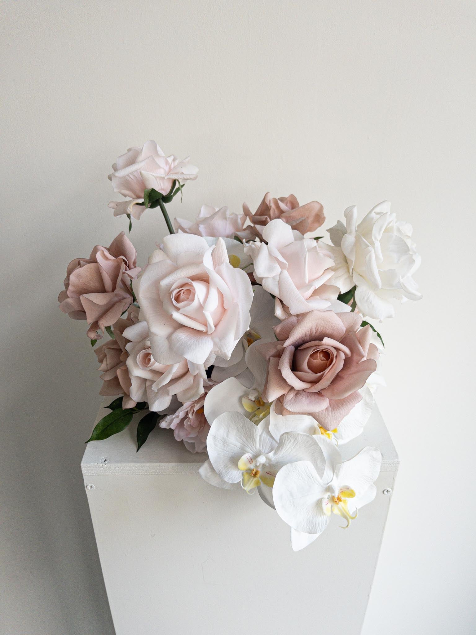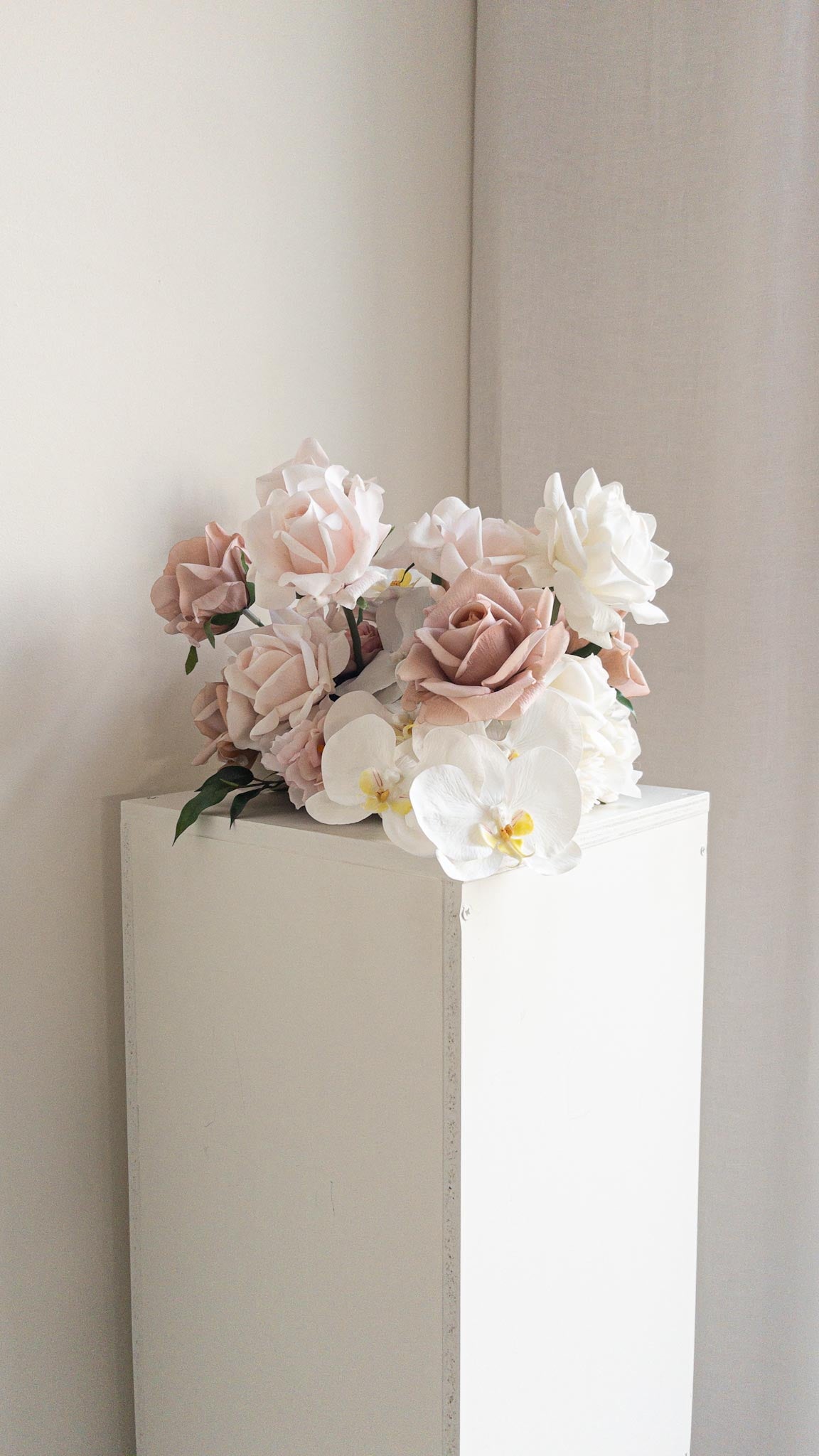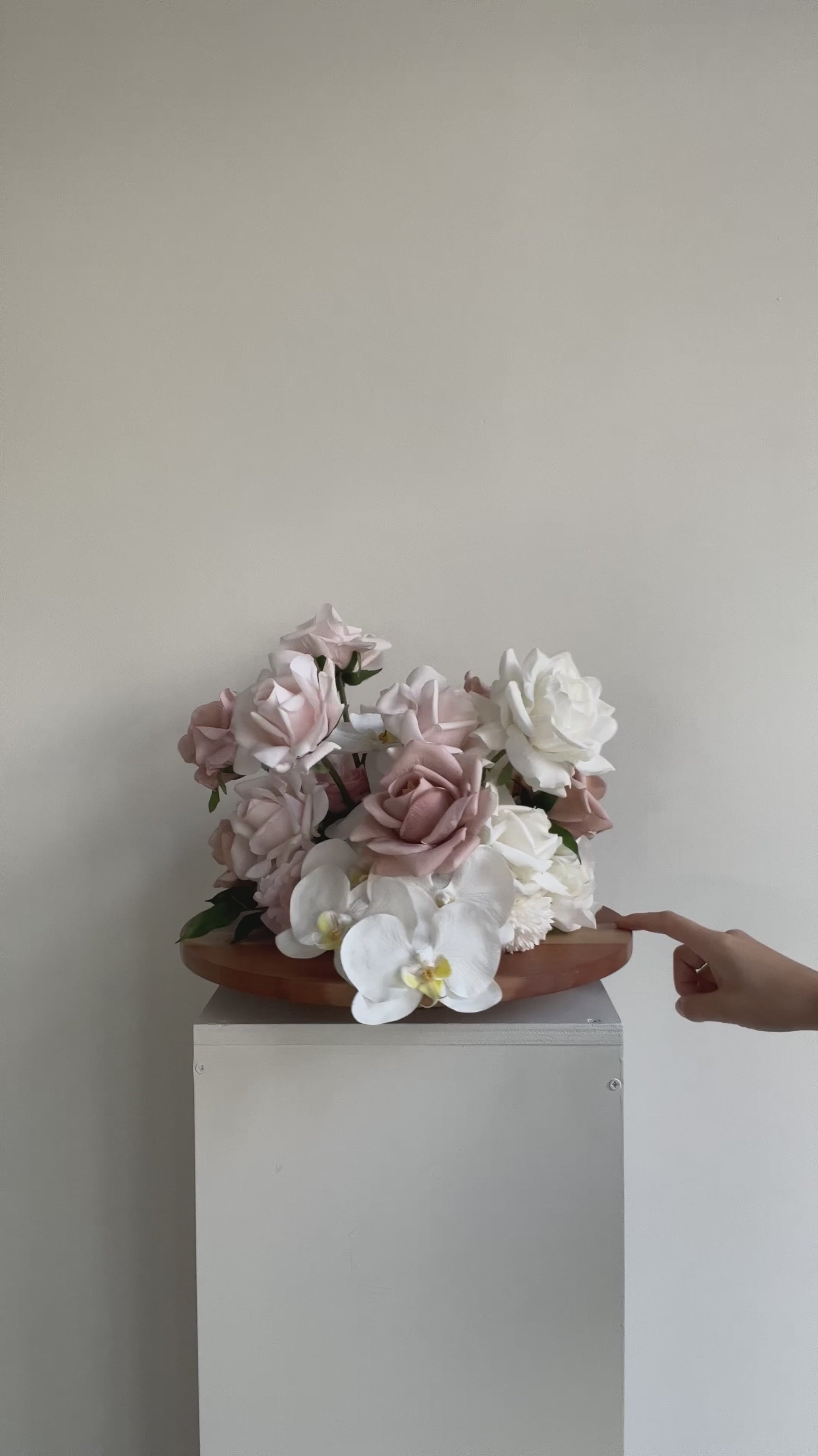 Het tafelstuk uit de Doris collectie bevat maar liefst 17 real touch rozen die er niet alleen fris uitzien, maar ook aanvoelen als verse rozen. Je gasten zullen niet geloven dat het zijden bloemen zijn. Een mooi, grote orchidee maakt het elegante ontwerp helemaal af.